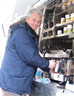 He follows the film crew around on location in his coffee bar-on-wheels and has seen sales of his lattes, cappuccinos, mochas and espressos jump almost ten-fold.