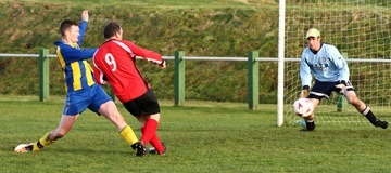 determined home side though. The visitors were first to show when David O’Connor found space to drill a low shot just wide of Carrowmenagh keeper Mark Doherty’s right hand post. The home team upped the pace then and Mark McGonigle fired over from the edge of the area before Samuel Bredin fired narrowly wide. James McDermott then blazed over the top before at the other end Derek Doherty fired just over from the edge of the area. Culdaff went close again on 31 minutes when Martin McGrenaghan’s powerful header was brilliantly saved by Doherty diving to his right. Before the break Gerard Gill for the home side had a crisp 25-yards effort well saved low to his right by George Houten. The visitors hit the crucial goal on 55 minutes after Declan Noone released Derek Doherty to fire a low shot from fifteen yards past Doherty. Carrowmena responded and Gill had an effort saved by Houten before the same player had a free kick well saved. |