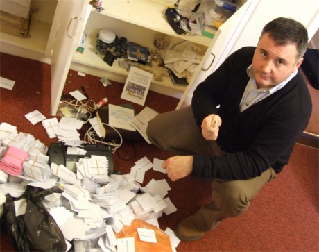 Fr Gerard Sweeney clears up his office after raiders ransacked his home in Burt on Ash Wednesday. He shows one of the 8 inch screws used by the gang to threaten his friend.
