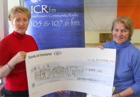THE organisers of the ICRfm Septemberfest have handed over a cheque to help the work of Insight Inishowen (formerly Buncrana Community Combating Suicide). A sum of €306 was raised through the music event held last month in McGrory's, Culdaff. Septemberfest organiser Marianne Ashcroft said: "We are delighted to be able to support the excellent work of this group and a big thank you to all the musicians who performed on the night." The performers included Moville Gospel Choir, The Teraways, James and Niamh and Paddy Nash and the Happy Enchiladas.