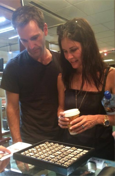 Mum-of-one Cox, casually dressed in a black vest-top and white skinny jeans, is seen happily smiling and chatting with staff as they discuss the background to the impressive rings. Meanwhile, McDaid attempts to pay for the jewellery.