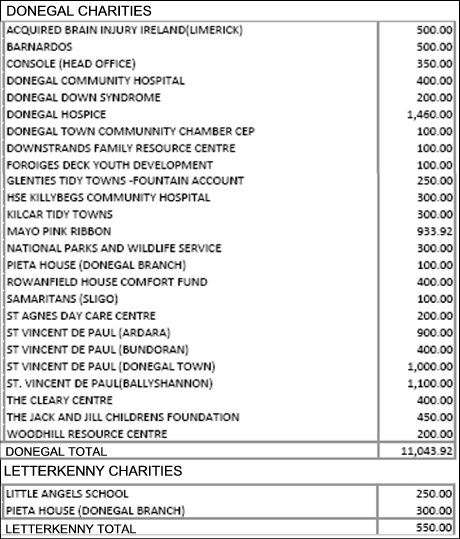 The biggest beneficiary was The Donegal Hospice with €1,460. This was followed by the St Vincent De Paul Society in Ballyshannon which got €1,100 followed by the SVP Donegal Town conference (€1,000). Other Donegal charities received smaller amounts ranging from €100 to €900.