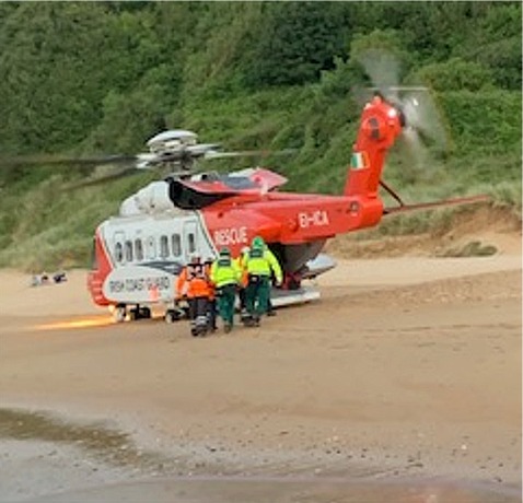 The Greencastle Coast Guard boat transported two HSE paramedics from the beach and to the casualty location. The casualty was then placed in a stretcher and transported by boat to the beach where the Sligo based Coast Guard Helicopter, Rescue 118, had landed.