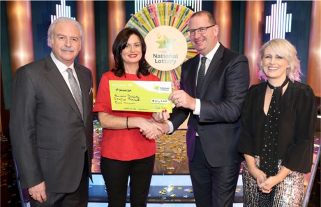 Pictured at the presentation of the winners cheques were from left to right: Marty Whelan, Winning Streak game show co-host; Annmarie Doherty, Niall Andrews, Head of Sales and Operations at the National Lottery and Sinead Kennedy, Winning Streak game show co-host. The winning ticket was bought from GALA Express in Drung.