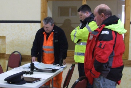 Coast Guard area officer, Charlie Cavanagh from Greencastle discusses the search and recovery plan yesterday with Buncrana Garda Inspector David Kelly and Danny Keenan of the True North Diving Club in Malin at the search co-ordination centre based in Glengad Community Development Association building.