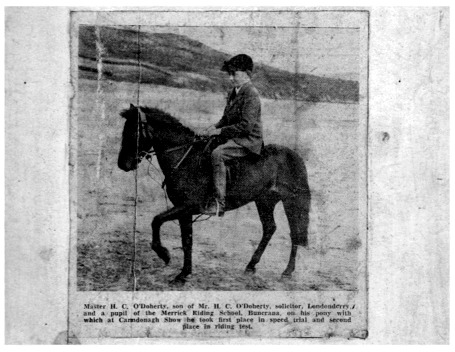 The black-and-white newspaper photo depicts Buncrana solicitor Ronnie H.C. O'Doherty as a young equestrian sportsman on his mount 'GE' in 1938. A pupil of the local Merrick Riding School, he had just taken first place in the Speed Trial and second place in the Riding Test 2 on his trusty pony.