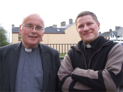 Buncrana parish priest Fr John Walsh and local Polish priest Fr Rafal Januszewski wait in the queue for the film.