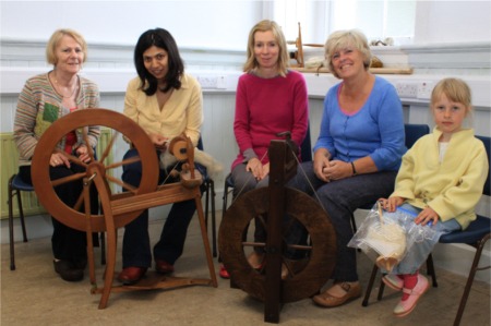 Canadian artist Seema Goel spinning sheeps' wool with local volunteers.