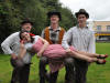 Maria Doherty (Dorothy) gets a lift from Brendan Fletcher (Zeke), Phil Ruddock (Hickory) and Andrew McCracken (Huck) during rehearsals for the upcoming Wizard of Oz in St Mary's Hall, Buncrana.