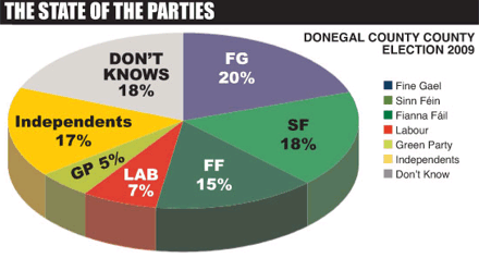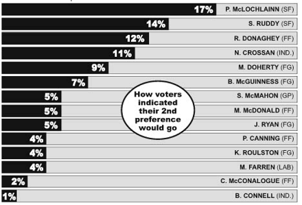 Of these it would seem that Batty Connell and Charlie McConalogue look least likely to be in the shake-up when it comes to the race for seats but Mickey Doherty could press for the seat held by Bernard McGuinness or Marian McDonald with figures showing he could attract 9% of second preferences, ahead of 7% for both sitting councillors.