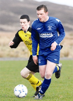 A Terry Doherty cross was headed just over by Patrick McDermott and Doherty himself flashed a shot just wide soon afterwards. Ballybofey came back with a free kick from Paul Finn landing on the roof of the net. Ballybofey were defending heroically but they couldn’t keep the floodgates closed forever and Glengad equalised midway through the half. Glengad were indebted to Ballybofey’s keeper Dean Doherty who suffered a rush of blood to the head coming for a ball outside his area – the ball was knocked forward and John McDermott couldn’t miss.