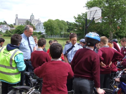 Garda Gerard Treacy and Garda Anne McGreal talk to children from St. Patrick's Boys' School about road safety during the Pedal Right presentation day.