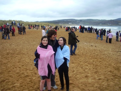 Twins Sarah and Kate Mellotte and their mum Nuala, from Belfast take the plunge for the New Year's Day swim at Culdaff.