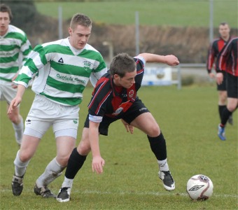 and Martin Farren completed the clearance. The team from the Waterford/Tipperary border town produced Reading and Ireland’s Stephen Hunt and in Kavanagh they had another all-action attacker who liked nothing better than to run with the ball right at the middle of the Redcastle defence. Somehow Redcastle made it to the break up by a goal, but there was to be no relief as Carrick penned them in to their own half in at the start of the second period. It was no surprise when the visitors equalised in the 62nd minute. Stephen Hassey was fouled just outside the Redcastle area. Kavanagh stepped up and curled a free kick, |