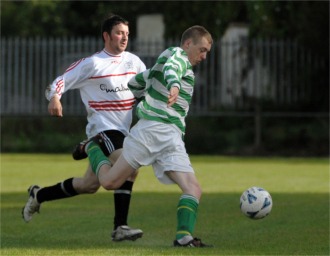 advancing Stephen Porter. His effort was worthy of a goal, but it came off the post and on another day might have fallen differently, but Doherty’s hard work was rewarded when the rebound came back into his path and he slotted into the empty net to give the visitors the lead. It was a shock to the home side who had the best of the play in that opening half hour, prompted by some excellent midfield play from Aaron McLaughlin who looked neat on the ball throughout. Unable to press forward and add to their lead, Carndonagh instead found themselves pressed back again and eight minutes after they had taken the lead, they were back |