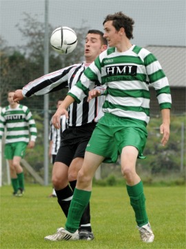 Battling against a strong wind Carrowmena were finding it difficult to carve out chances against the home side, although Paul Duffy did manage to force Leo McColgan into a smart save with his feet with a good shot in the 7th minute.