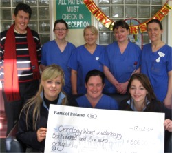 Pictured are Carndonagh Community School students, Saoirse Kearney and Danielle McKeeney, front, presenting a cheque for €606 to staff from the Oncology Unit in Letterkenny General Hospital.
